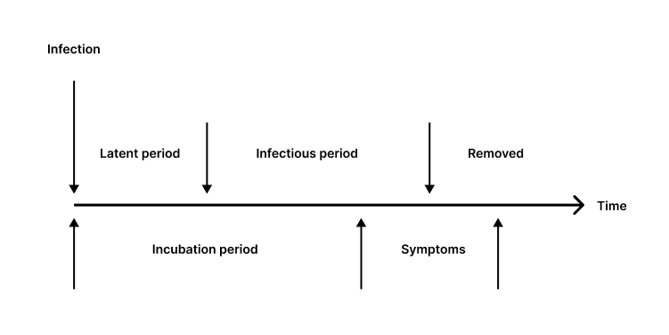 The labels above the line in Figure 4 describe the host's infectivity, while those below the line describe the disease dynamics. Note that the infectious period may begin before or after the onset of symptoms.